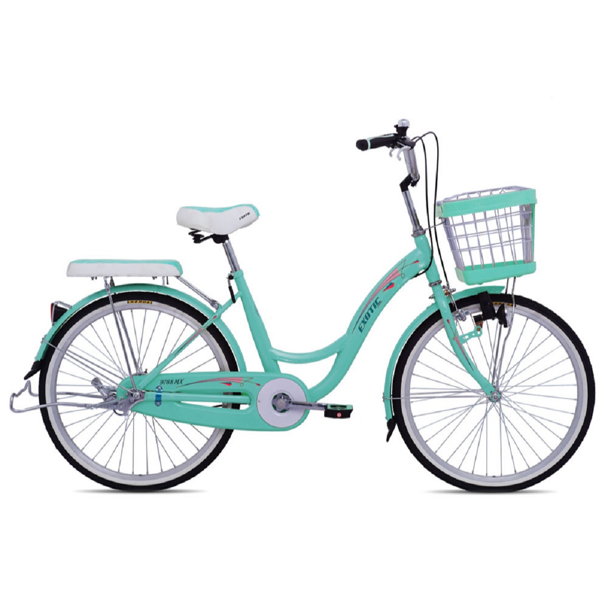 Sepeda Mini Exotic 9788 MX 24 Inchi merupakan sepeda menengah dengan harga terjangkau. Sepeda ini hadir dengan empat varian warna Cream/Green, Grey/White, Pink, dan Tosca/Green. Anda bisa mendapatkan sepeda ini di jaringan toko Jago Sepeda.